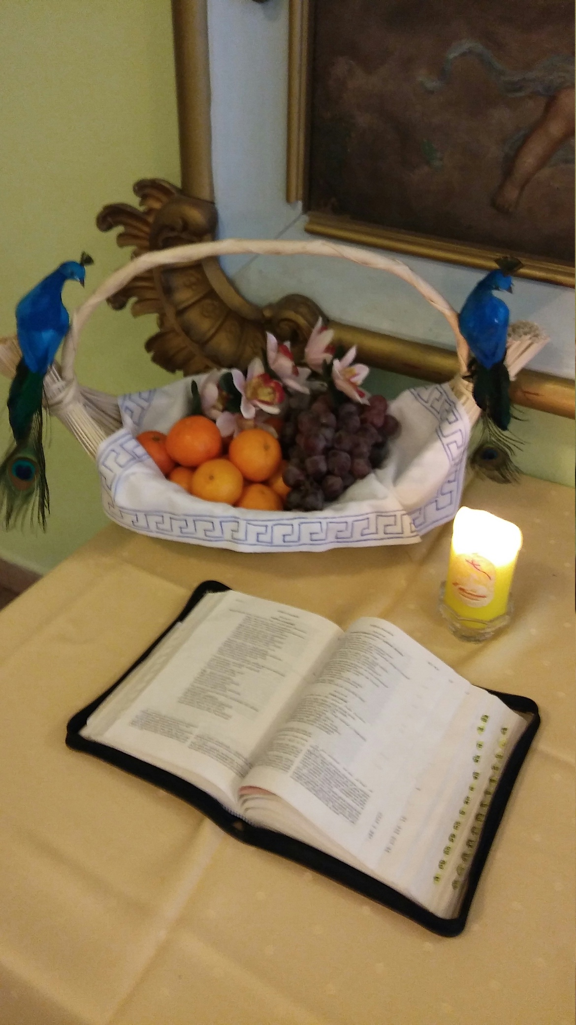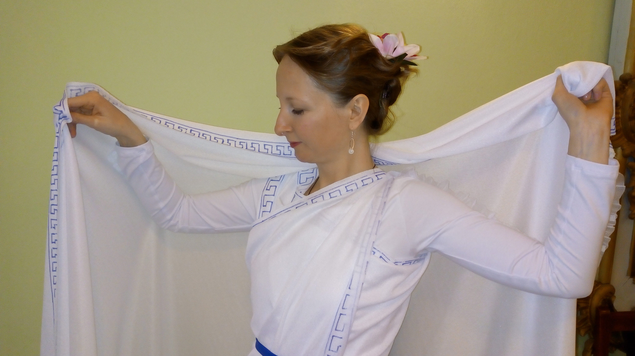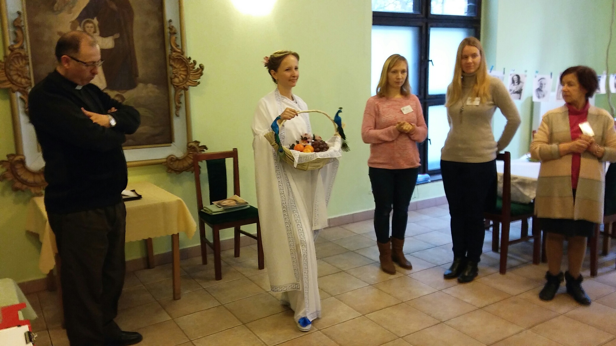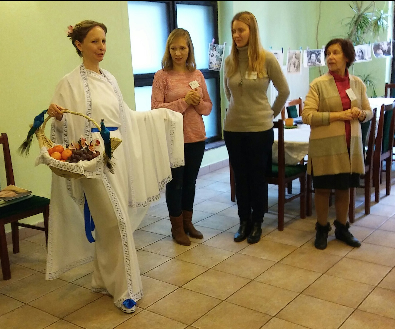 Tymczasem w trakcie warsztatów pojawiła się u nas grecka Gracja … nie przesadzam, bo to była właśnie ona – odziana od stóp do głowy w białą szatę z typowym greckim wzorem wzdłuż brzegu, przepasana niebieską wstążką, uczesana jak starożytne Greczynki, a do tego trzymała w ręce kosz z owocami.